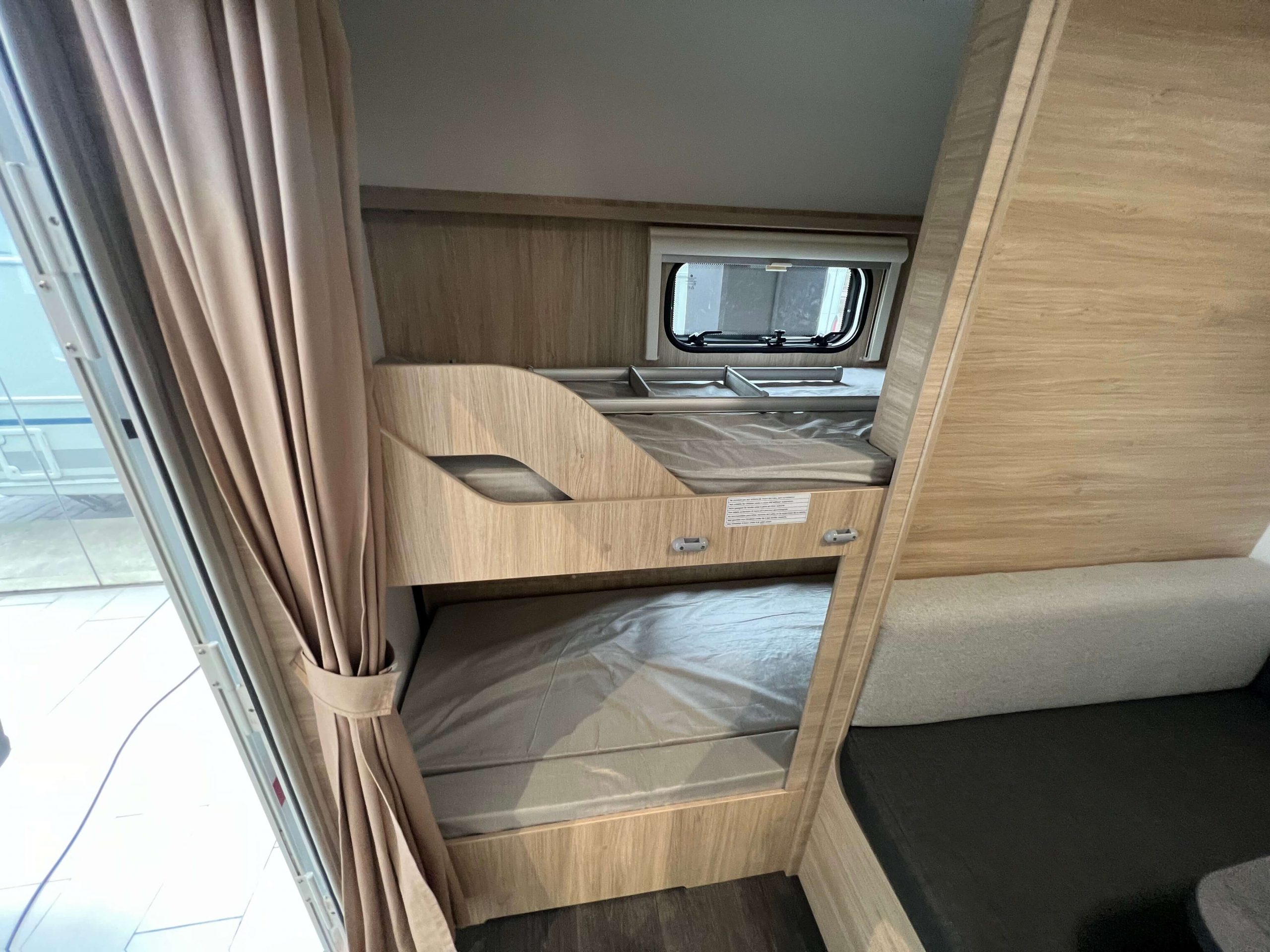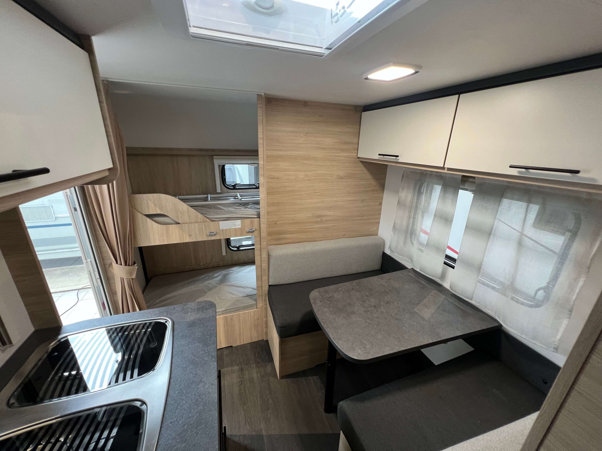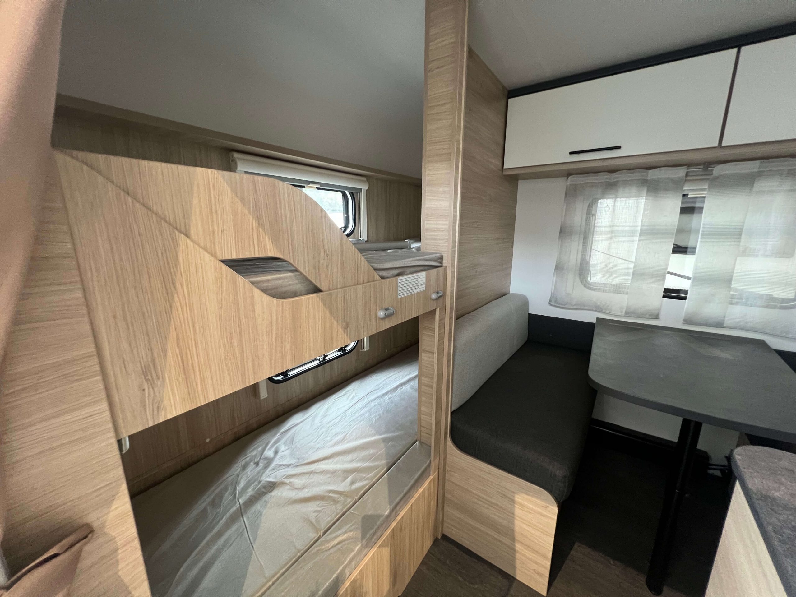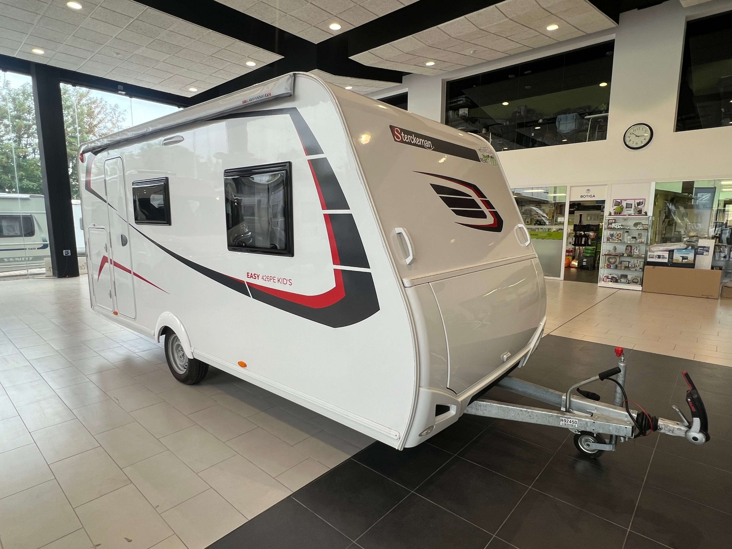 La Sterckeman Easy 426 es una caravana de 1.150 kgs, pero que incluye todo lo necesario: cama de matrimonio en la parte frontal, literas en la parte posterior y salón en la parte central convertible en cama de matrimonio, cocina completa y baño.