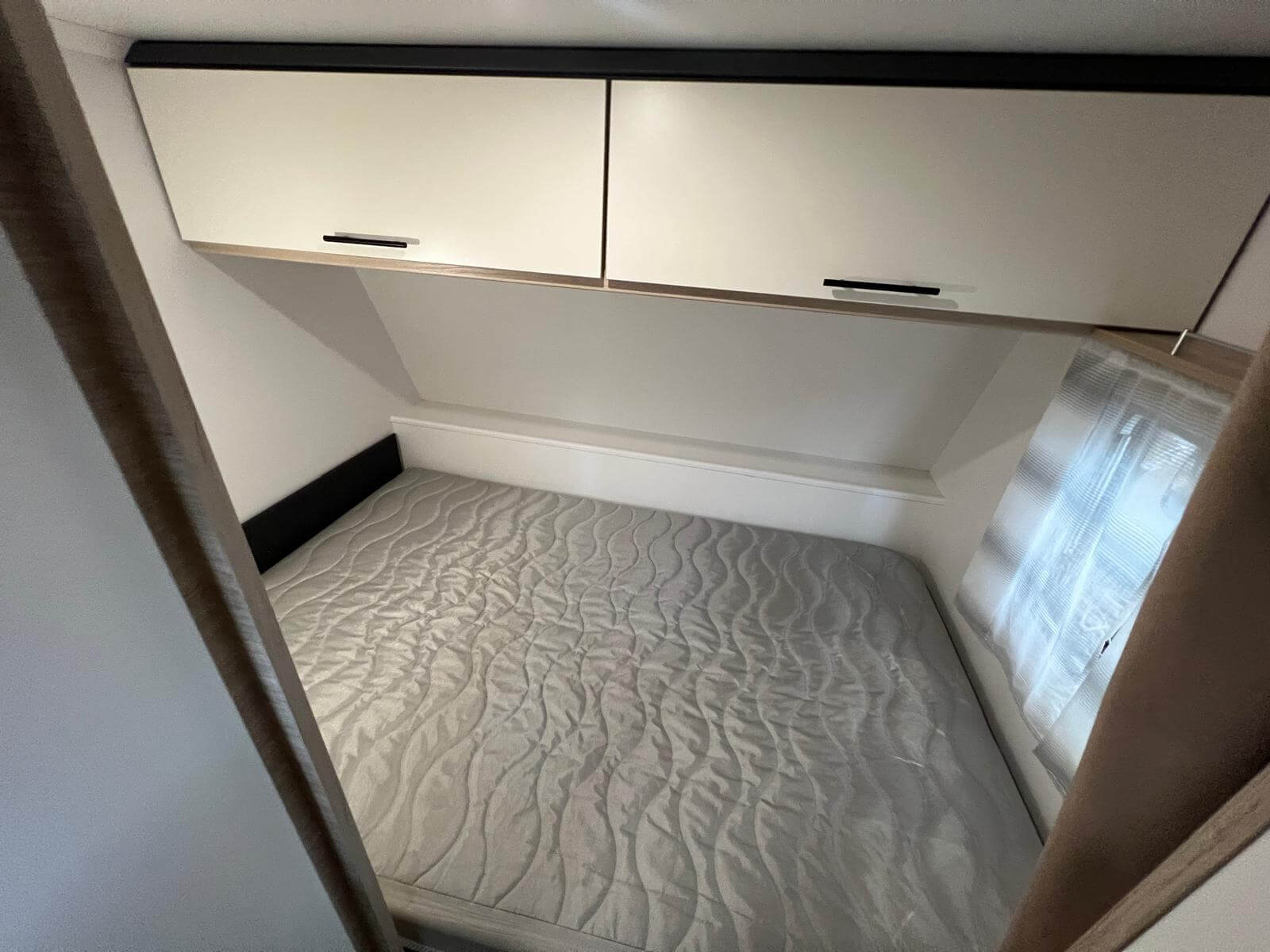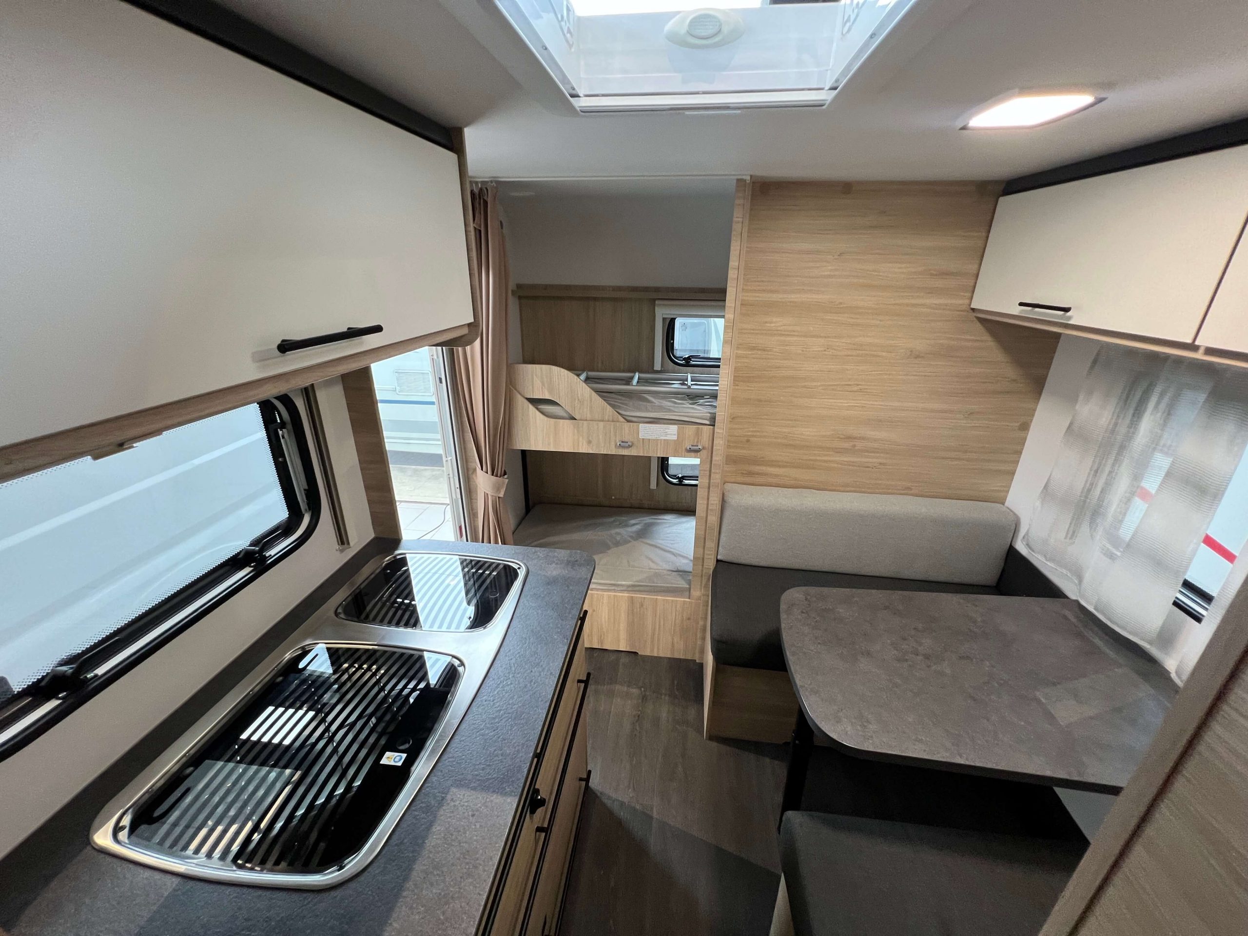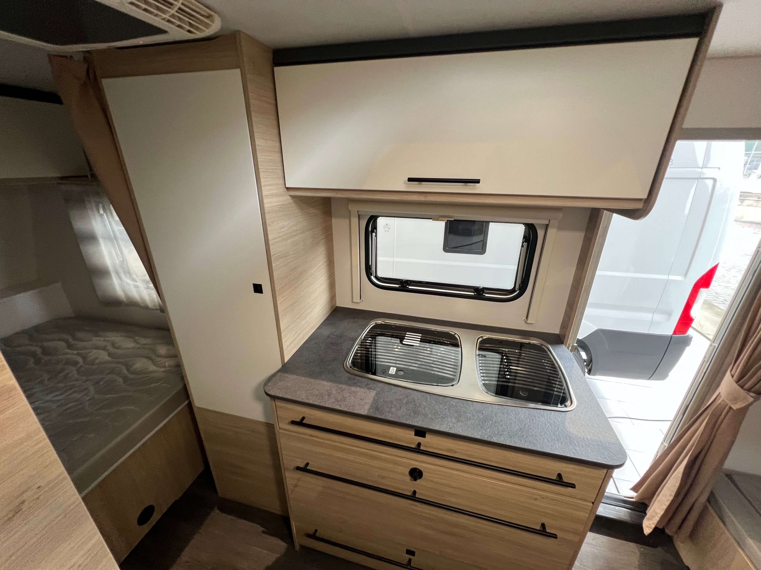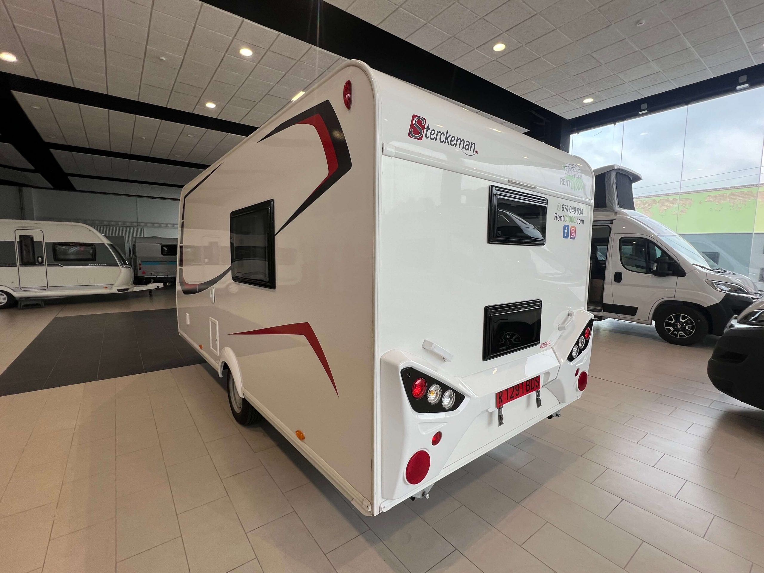 La Sterckeman Easy 426 es una caravana de 1.150 kgs, pero que incluye todo lo necesario: cama de matrimonio en la parte frontal, literas en la parte posterior y salón en la parte central convertible en cama de matrimonio, cocina completa y baño.